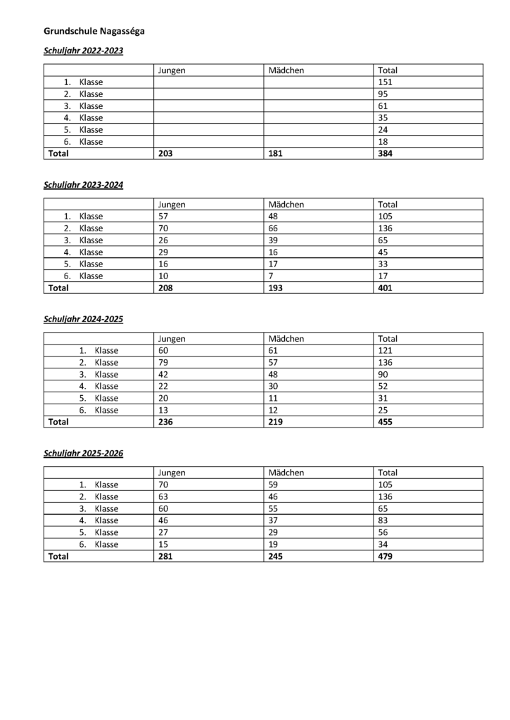 Die neuesten Zahlen der Grundschule Nagasséga zeigen ein Wachstum der Schülerzahlen von ca. 25% über die letzten drei Jahrgänge.
